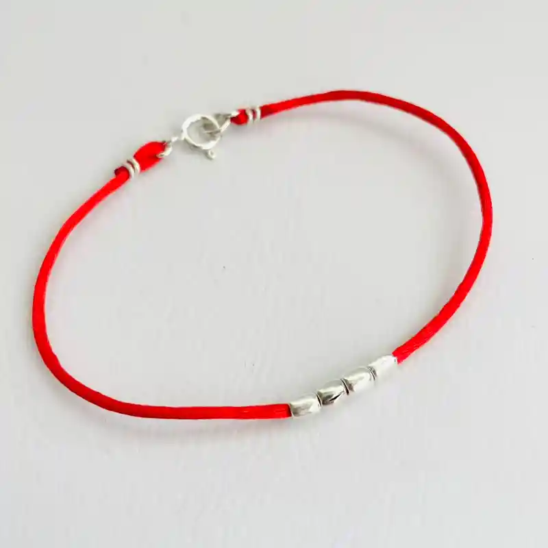 Pulsera satín roja con 5 mostacillas gorditas al centro. Mostacillas y terminaciones de plata. Largo total 17cm.