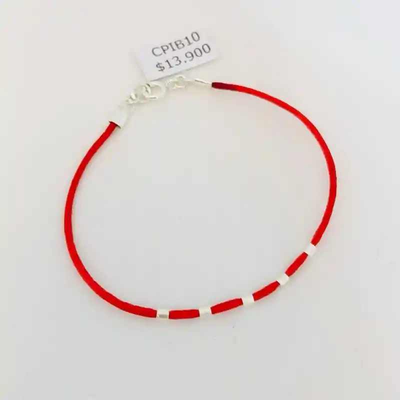 Pulsera roja con hilo satinado y 5 mostacillas de plata intercaladas. Terminaciones también en plata. Largo pulsera: 17cm.