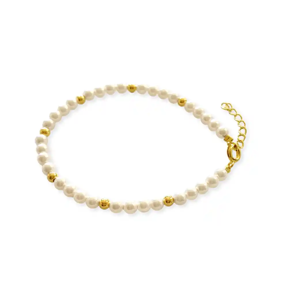 Elegancia y delicadeza en cada detalle. Con bolitas de Shellpearl de 4mm, esta pulsera Enchapada en Oro 18K es hipoalergénica y libre de níquel, ideal para un estilo clásico y sofisticado. Medidas: Largo total pulsera 17cm más 3cm de extensión. Diámetro perlas shellpearl 4mm. Diámetro de cada bolita enchapada 3mm. Peso 4,1gr.