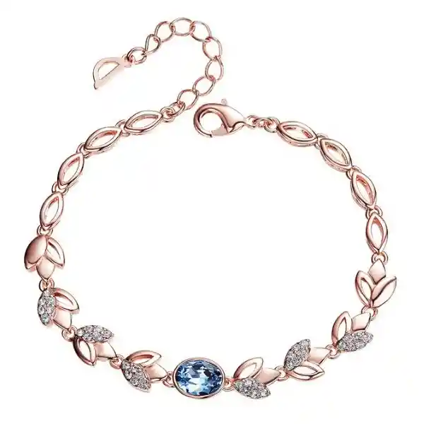 Pulsera hecha con Cristales Austriacos. Bañada en Oro Rosado. Largo: 17,5 cm más 4,5 cm de extensión. Color Cristales: Celeste. Libre de níquel y plomo. Incluye elegante caja. Metal base: Bronce.