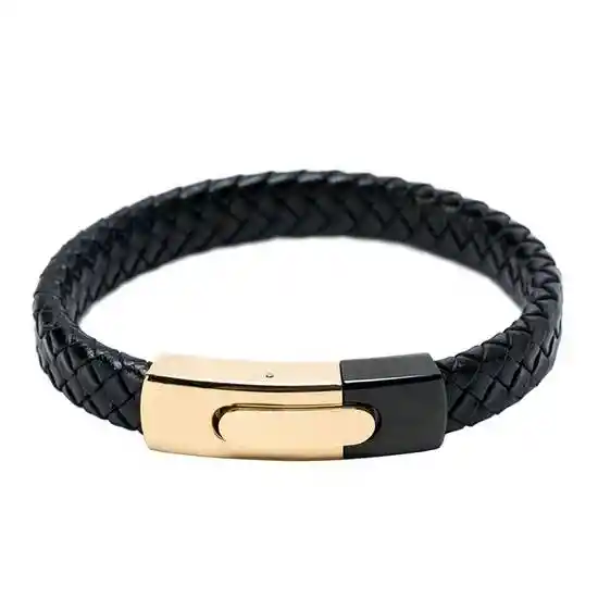 Pulsera de Lujo Elaborada en Cuero Texturado Color Negro y Broche Elegante de Acero Inoxidable en Combinación Del Negro y Dorado. Sistema de Cierre Con Broche a Presión. 185 cm (Diámetro)