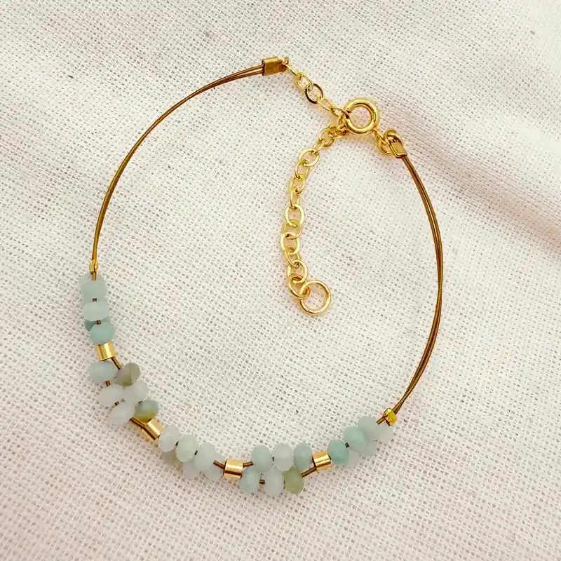 Pulsera de la marca Caroco, trenza con piedras Amazonita naturales sobre hilo de acero dorado. y terminado con una pequeña cadena. Largo total desde 16cm hasta 21cm. para poder ajustarlo a la medida de cada muñeca. Terminaciones de bronce bañado en oro de 18k.