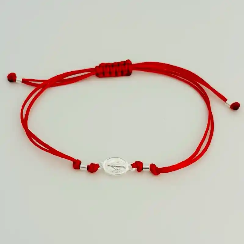 Pulsera de hilo roja con medalla de la virgen de los rayos en plata, terminación con nudo ajustable.