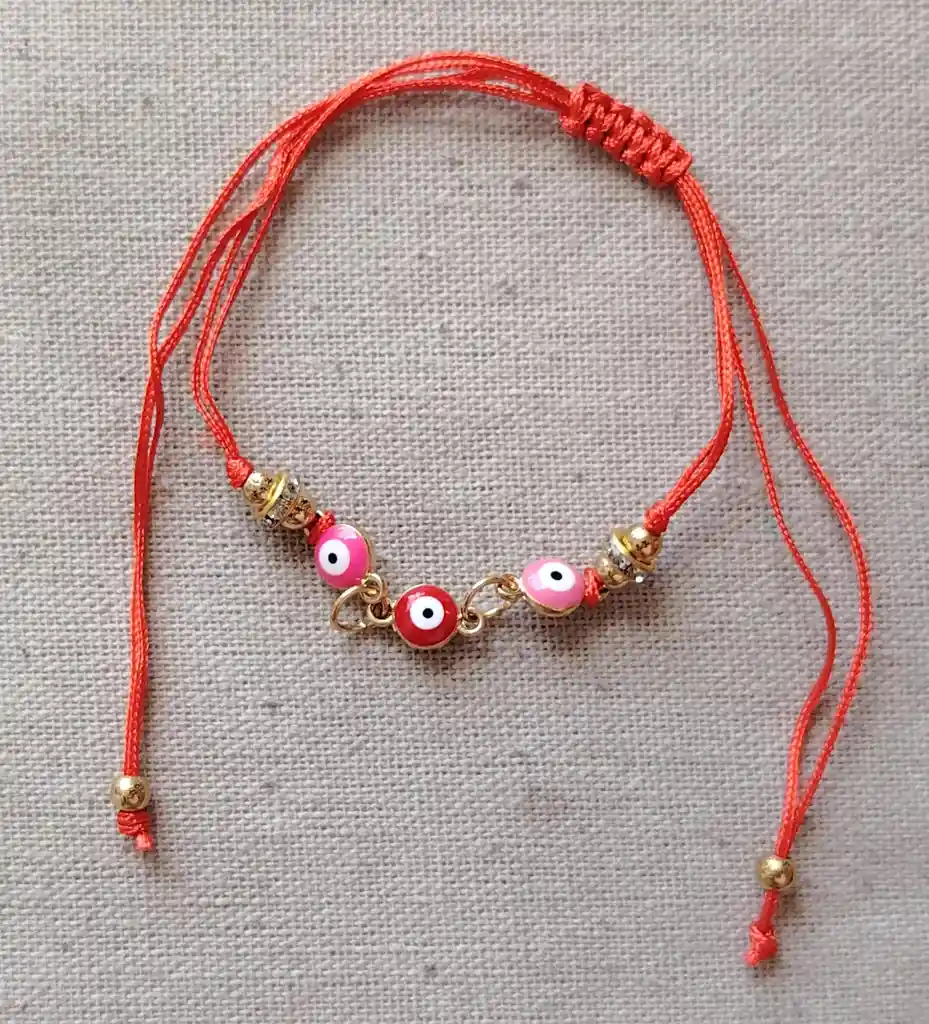 Pulsera ajustable con detalles de ojo en tonos rosados y rojos, ideal para usar a diario y combinar con cualquier estilo.