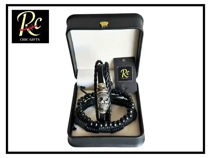 "Audacia, estilo y personalidad en un solo detalle. Este set de pulseras negras con diseño de cuentas y dije de calavera es el regalo para hombre ideal para quienes buscan marcar presencia con un accesorio único. Presentado en un estuche de cuero con corona dorada, transmite fuerza y sofisticación desde el primer vistazo. Las pulseras son fabricadas en República Dominicana, fusionando diseño atrevido con esencia caribeña. Disponible en Regalos Chic, especialistas en regalos corporativos y exclusivos. Regalo para hombre Pulseras con calavera Pulseras negras hombre Accesorios masculinos con estilo Regalos corporativos premium Pulseras fabricadas en República Dominicana Regalos Chic Chile"