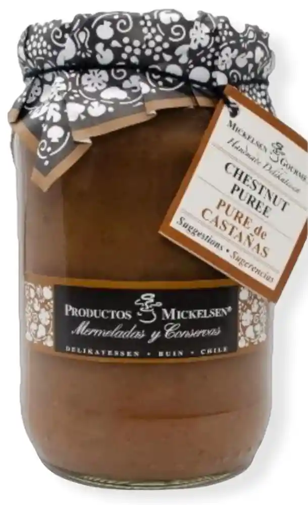 PURE DE CASTAÑAS 400g Marca: Mickelsen Puré de castañas cremoso y dulce Su sabor único, permite acompañar varios tipos de preparaciones y cocinar diferentes recetas. Ingredientes: Castañas, azúcar y vainilla. USOS: rellenos de tartas, alfajores, kuchen y repostería en general. También muy extendido su uso en carnes, un solomillo de cerdo con puré de castañas te sorprenderá!