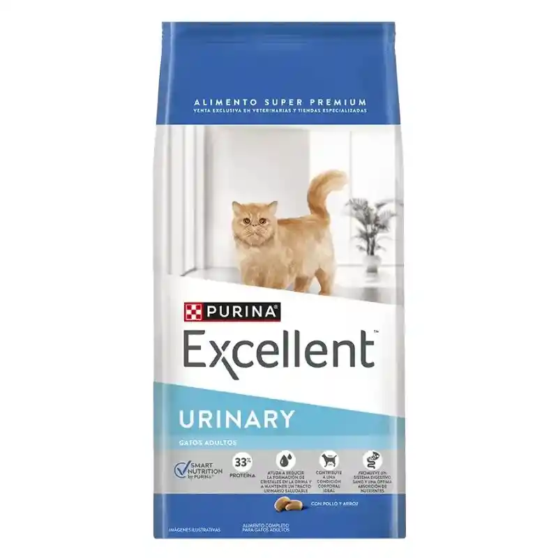 Descripción PURINA® Excellent® Adulto Urinary Pollo y Arroz, ofrece una nutrición especializada para los gatos con un sistema urinario sensible, formulada a base de proteínas de alta digestibilidad, para ayudar a mantener el tracto urinario saludable y colaborar en reducir la formación de cristales en la orina. Características: CONDICIÓN CORPORAL IDEAL La utilización de fuentes de proteína de elevada digestibilidad garantiza el aporte de aminoácidos esenciales que ayudan a mantener músculos fuertes y sanos. Así́, cualquiera sea el nivel de actividad física de tu gato, puedes estar seguro de que sus necesidades proteicas estarán satisfechas. AYUDA A REDUCIR LA FORMACIÓN DE CRISTALES EN LA ORINA Un adecuado nivel de sodio ayuda a incrementar la ingestión de agua, diluyendo la orina, ayudando a disminuir la formación de cristales y manteniendo la salud del tracto urinario. TRACTO URINARIO SALUDABLE Una óptima combinación de ingredientes ayuda a mantener un pH adecuado en la orina, el cual contribuye a la reducción de la formación de cálculos y cristales, colaborando con el mantenimiento de un tracto urinario saludable, fundamental para la salud de tu gato.