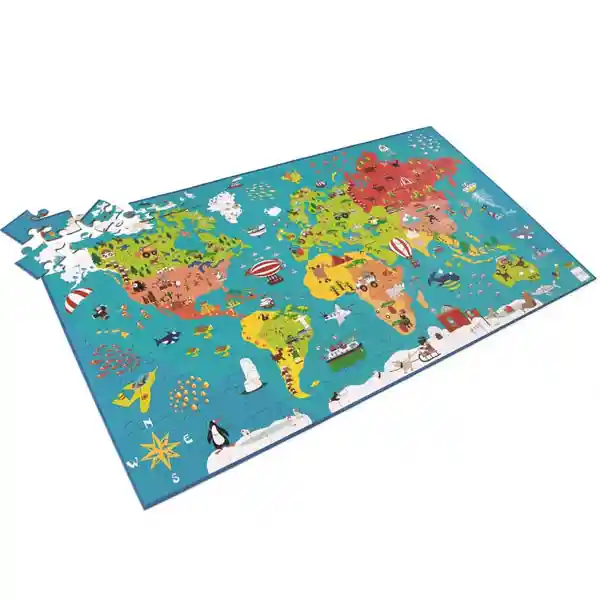 Precioso puzzle de 150 piezas del mapa del mundo, que no sólo será divertido de armar sino que sirve para aprender los continentes y aspectos culturales. Tamaño armado 91 x 48,5 cm. Hecho en cartón altamente resistente. Edad Recomendada +6 Años