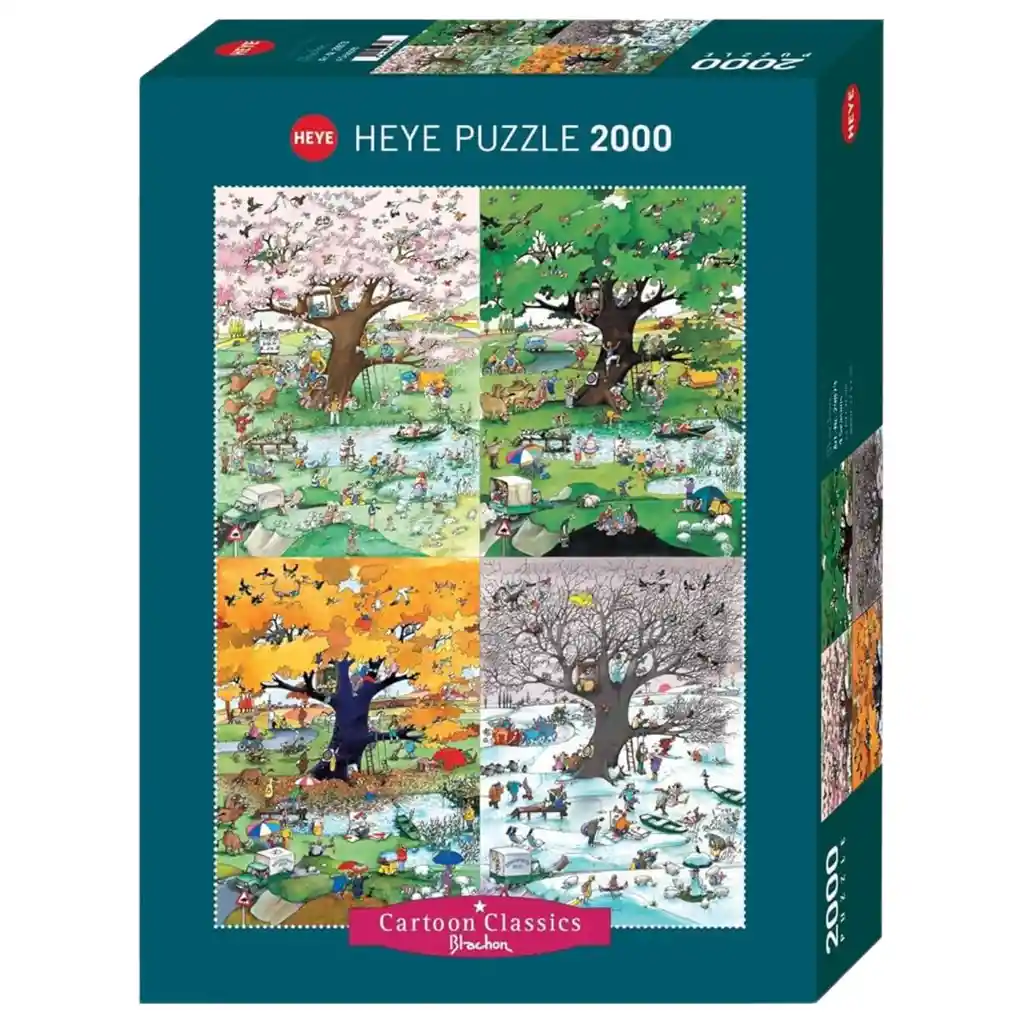 En el rompecabezas vibrante y expresivo, 4 Seasons by Heye, se muestran cuatro ilustraciones diferentes. Cada imagen es de la misma escena, pero de una temporada diferente. Un arbol gigante en un parque se cierne sobre los asistentes al parque mientras disfrutan cada temporada. En el verano, la gente hace picnic y va en bote mientras que en el invierno, patinan sobre hielo y se aseguran de vestirse con bufandas. Este rompecabezas es una actividad divertida para participar en cada estacion del ano.