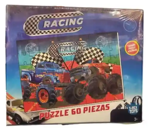 Entretenido Puzzle de 48 piezas, con motivos de camionetas gigantes, Racing. Tamaño del Puzzle armado es de 43 x 30 cm. Este producto cumple con la norma EN71-3. Se recomienda de 3 años en adelante. Fabricado en Chile.