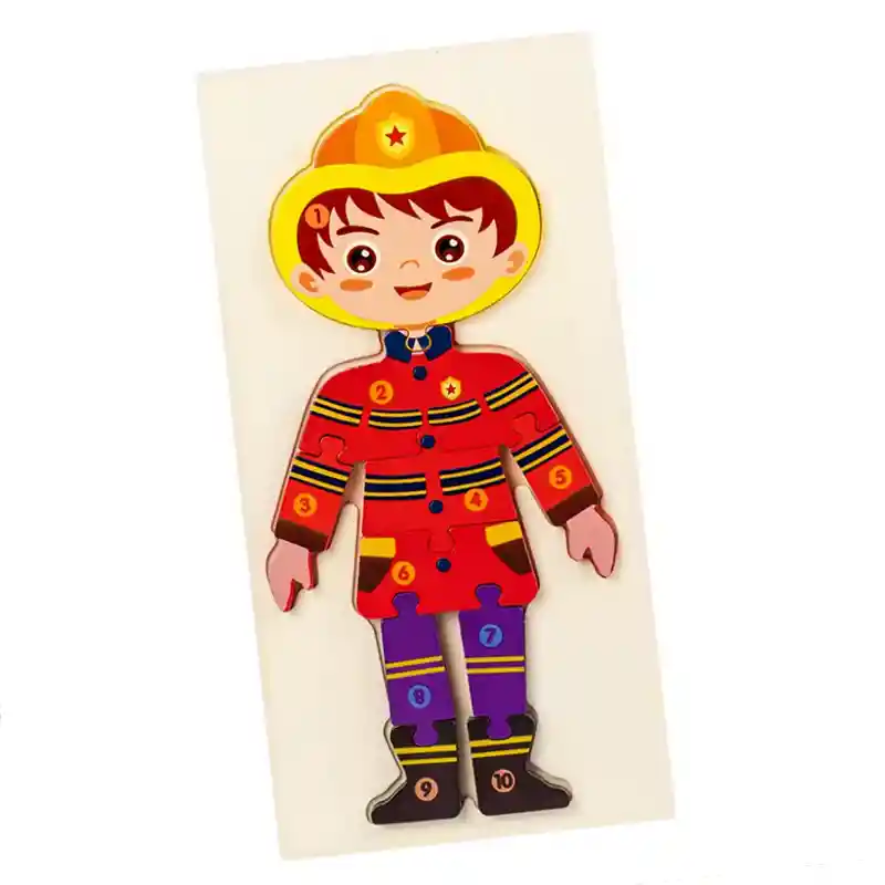 . Favorece la coordinación mano–ojo, la motricidad fina y la resolución de problemas al encajar cada pieza, lo que estimula el pensamiento lógico. . Permitir la identificación de profesiones y sus roles como la de bombero, policías, maestras entre otras, a través del Juego. . Contribuye al reconocimiento del cuerpo humano y su estructura a través de las piezas. . Fortalece la concentración, mejora la memoria visual y desarrolla habilidades cognitivas importantes en la infancia. . Fomenta la paciencia y tolerancia a la frustración e incentiva la autonomía mientras el niño arma el rompecabezas de manera independiente. . Es perfecto para actividades Montessori, uso en salas cuna y jardines infantiles, así como para juegos guiados de psicomotricidad y juego educativo en casa. Especificaciones: Material: Madera. Medida: 30 cm x 15 cm (aprox). Apto para edades: Entre 3 y 6 años. Diseños: Bombero Contiene: 1 tabla base y 10 piezas de rompecabezas.