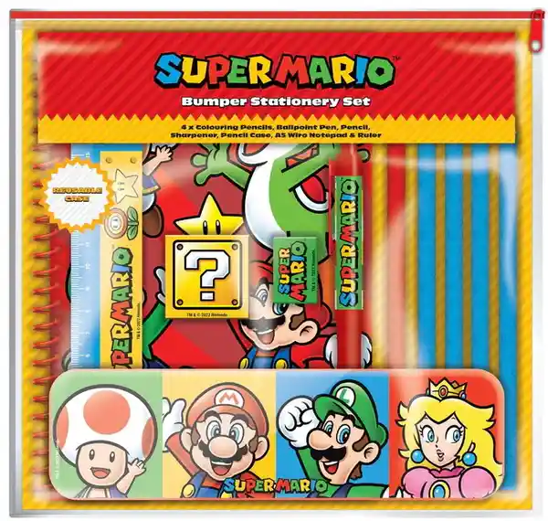 Juego Contiene 10 Unidades. Bumper S. Lleno de Útiles Escolares en un Paquete Reutilizable Que Incluye un Estuche de Hojalata un Cuaderno A5 4 Lápices de Colores un Bolígrafo un Lápiz Una Regla y un Sacapuntas Perfecto Para Anotar Los Puntajes de Los Juegos Características Súper Mario. La Querida Mascota de Nintendo Que Vive en el Reino Champiñón se Muestra Con su Tupido Bigote Negro y Luciendo su Icónica Gorra Roja. También Muestra Todos Tus Personajes Favoritos de Mushroom Kingdom Incluidos el Hermano de Mario Luigi Yoshi Toad y la Princesa Peach. Excelentes Regalos de Super Mario Para Fans de Nintendo: A Cualquiera Que Disfrute Ayudando a Mario a Derrotar al Malvado Rey Koopa y Restaurar el Reino Champiñón le Encantará Este Genial Juego de Papelería de Super Mario. Productos Originales de Super Mario: Basados en el Emblemático Videojuego Super Mario Bros. Y Con Licencia Oficial de Nintendo Co. Como Una Auténtica Pieza de Recuerdo de Videojuegos..