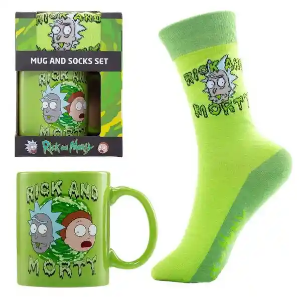 Set Contiene 2 Unidades. Taza de Cerámica Con Asa Con Capacidad Para 315 mL + Calcetines de Algodón Temáticos de Tallas 41-45 1 Und. Se Entrega en Una Caja de Cartón Con Dos Oberturas Que Permiten Ver Los Dos Elementos. Con Licencia Oficial de Rick Morty.