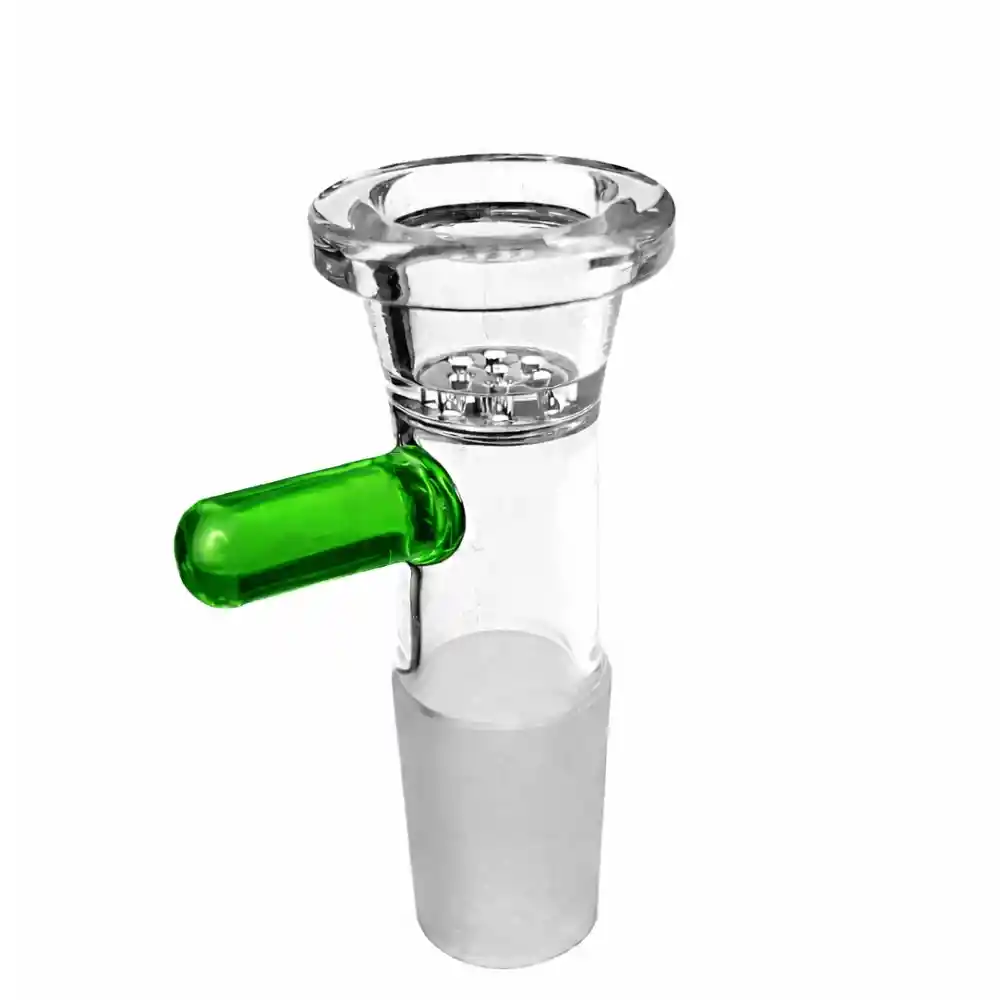 Quemador Honeycomb Genérico 14 mm Quemador de vidrio con base tipo panal que distribuye el flujo de aire de forma uniforme, ayudando a una combustión más pareja. Incluye asa lateral para manipulación cómoda y es compatible con bongs estándar de 14 mm.