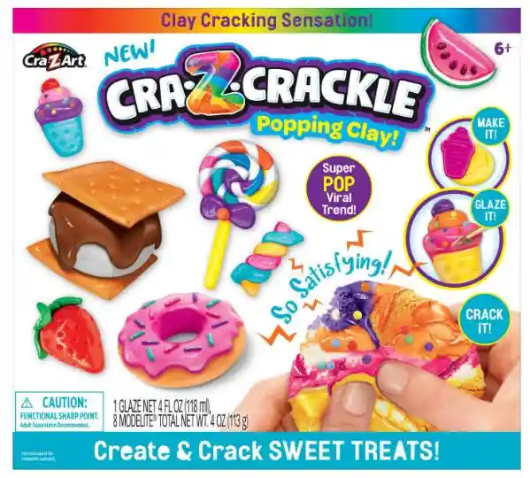 Cra-Z-Art Popping Clay! Create Crack Sweet Treats! 8 Modelos Moldea y haz dulces divertidos con arcilla de modelado y luego pinta en "esmalte agrietado" de secado rápido. Cuando se seca, simplemente agrieta, aprieta o aprieta para un sonido súper fresco y aprieta la diversión sensorial. Increíble esmalte agrietado se seca rápidamente, se seca a un acabado similar a la cáscara de huevo, manteniendo el compuesto suave esponjoso bajo el esmalte. Cuando se seca, explota y agrieta tus dulces dulces para un sonido súper satisfactorio y tacto ASMR. La arcilla Cra-Z-Crackle viene con modelite, esmalte, moldes, pinturas, pinceles y mucho más. La arcilla cra-Z-Crackle es divertida, sensorial e ideal para edades de 6 años en adelante. Incluye: 1 set de esmalte, 8 moldes.