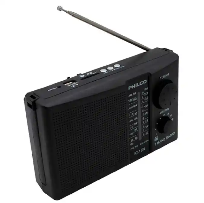 Radio Philco IC18R AM/FM Recargable • Radio FM-AM-SW 2 ondas cortas • Reproduce pendrive – Tarjeta SD • Incluye batería recargable • Cable AC Tipo 8 • Utiliza 2 Pilas Tipo “D” • Excelente sonido • Salida de Audífono 3,5 • Correa para transportar