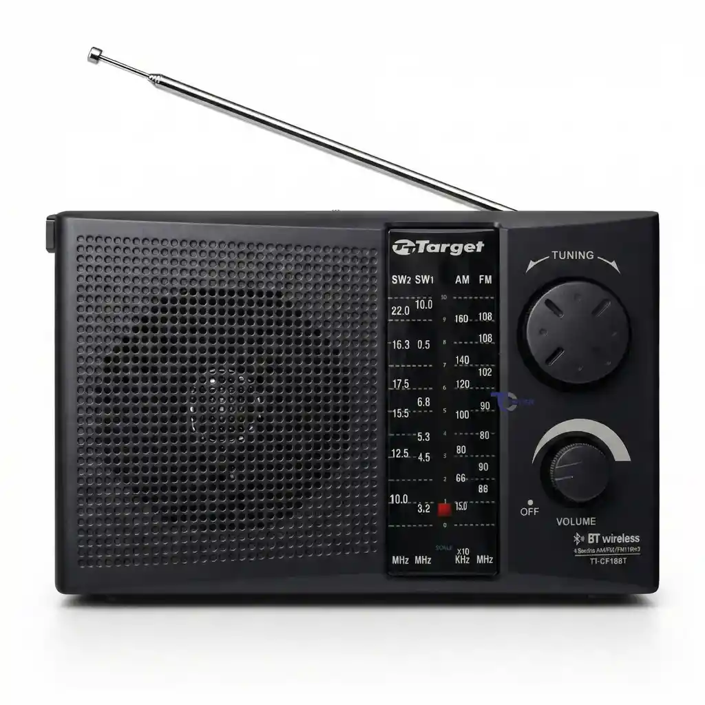 Disfruta de una experiencia de audio completa con la radio portátil Bluetooth Target TT-CF18BT, un equipo multifuncional que combina radio tradicional con conectividad moderna. Gracias a su recepción de 4 bandas AM, FM, SW1 y SW2, podrás acceder a una amplia variedad de emisoras locales e internacionales con excelente calidad de señal. Además, incorpora conexión Bluetooth, permitiéndote reproducir música de forma inalámbrica desde tu celular, tablet o cualquier dispositivo compatible. También cuenta con puerto USB y lector de tarjeta SD, ideales para reproducir tu música directamente desde pendrives o tarjetas de memoria. Su potente parlante de 3,5 pulgadas ofrece un sonido claro y fuerte, mientras que su múltiple fuente de alimentación brinda máxima versatilidad: puedes usarla conectada a la corriente, con pilas o con su batería recargable incluida. Perfecta para el hogar, exteriores, viajes, camping o emergencias. Características principales: Radio portátil con recepción de 4 bandas: FM, AM, SW1 y SW2 Excelente recepción de señal local e internacional Conexión inalámbrica Bluetooth integrada Parlante de 3,5 pulgadas con sonido potente y claro Puerto USB para pendrive Lector de tarjeta SD Batería recargable de litio incluida Funciona enchufada a 220V, con batería o con pilas Incluye cuerda de transporte para fácil movilidad Diseño portátil, resistente y práctico Ideal para: Escuchar radio AM/FM/SW Reproducir música vía Bluetooth Uso en el hogar Viajes y camping Emergencias y cortes de luz Uso portátil diario Accesorios incluidos: Cable de alimentación AC Batería recargable de litio Cuerda de transporte Especificaciones técnicas: Marca: Target Modelo: TT-CF18BT Bandas: FM / AM / SW1 / SW2 Frecuencia FM: 88 – 108 MHz Frecuencia AM: 530 – 1600 kHz Frecuencia SW: 3 – 23 MHz Conectividad: Bluetooth Tamaño del parlante: 3,5 pulgadas Entrada USB: Sí Lector tarjeta SD: Sí Medidas: 20x13x5.5 cm Alimentación: Corriente directa AC 220V Batería recargable de litio 3.7V / 1200 mAh (incluida) 2 pilas tamaño D (no incluidas) SKU Tecnocenter: 8609