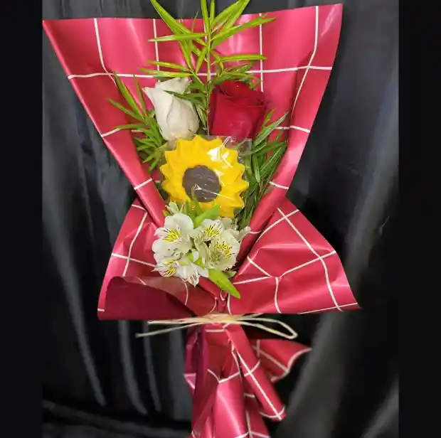 COMPUESTO DE 2 ROSAS ECUATORIANAS Y 1 GIRASOL DE CHOCOLATE Variados de color surtidos ideal para el Felicitaciones de color Multicolor ideal para el Felicitaciones