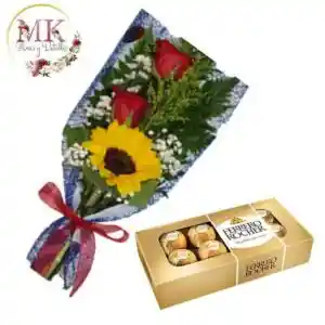 Ramito 2 Rosas y 1 Girasol más Bombones Ferrero Rocher 100 grs