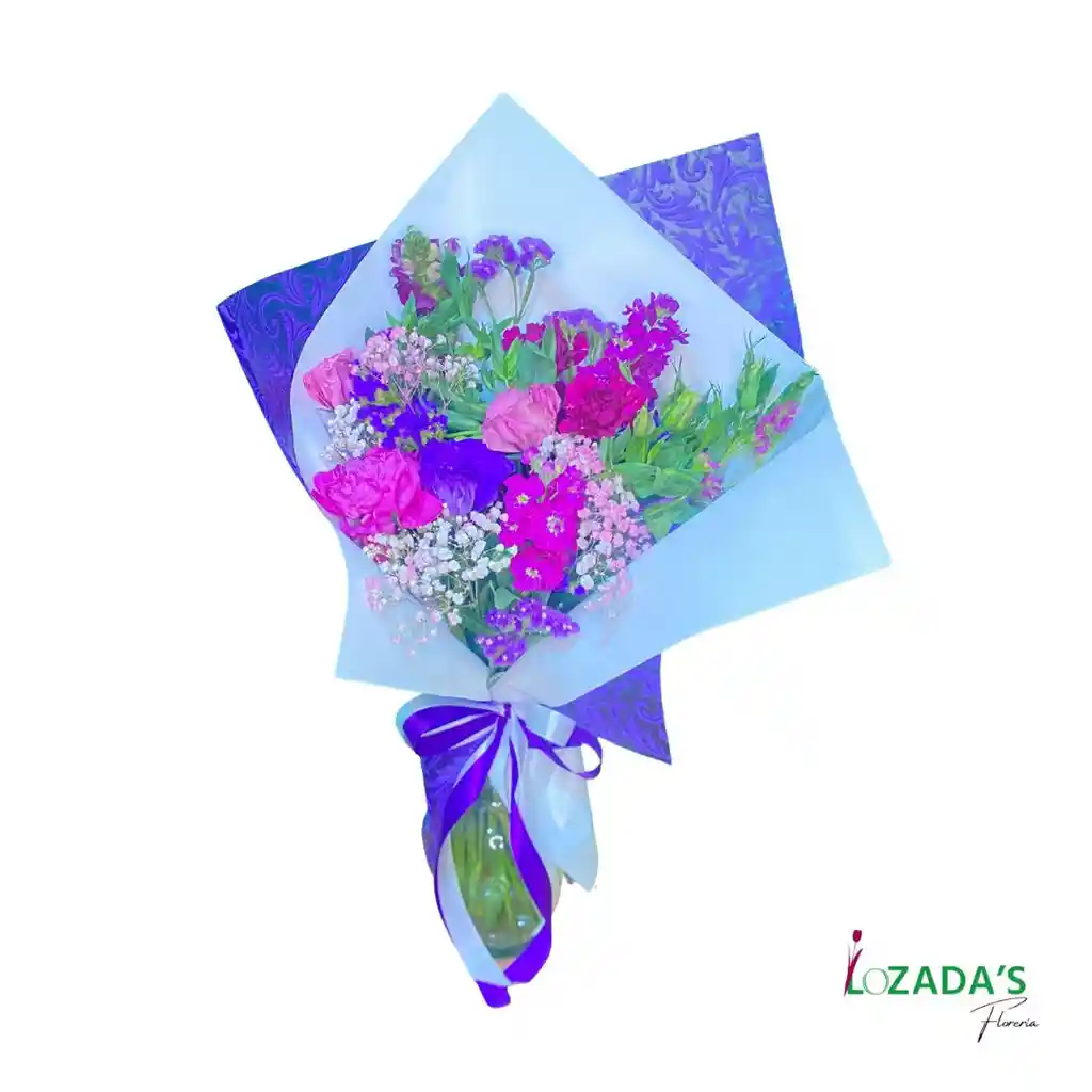 Confeccionado con Flores (Peonías, Lisiahnthus, Alelíes, statice, según disponibilidad) en tonos lila, morado, verdes selectos y flores de complemento (puede ser statice, gypsophila...) de 1 a 3 tallos de cada flor, de acuerdo a la elección del florista. En Chile, cada 9 de noviembre se regalan flores violetas como muestra de cariño, amor y recuerdo. Esta hermosa tradición nació gracias a la popular canción “Un ramito de violetas”, interpretada por Zalo Reyes, que cuenta la historia de una mujer que cada 9 de noviembre recibía un misterioso ramo de violetas de un admirador secreto.