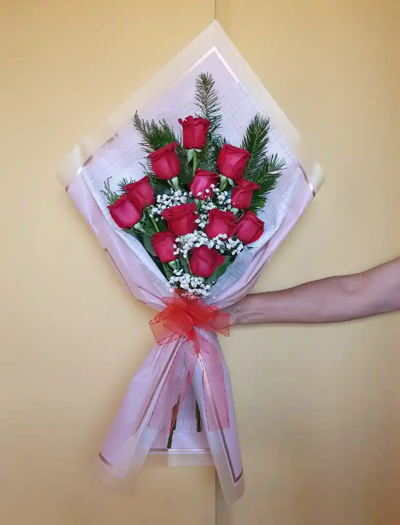 Ramo de 12 Rosas incluye follaje, papeleria y tarjetita. Rosas de color Rojo ideal para el Amor