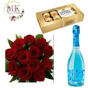 Ramo 12 Rosas, Bombones Ferrero Rocher 100 y Espumante Blue