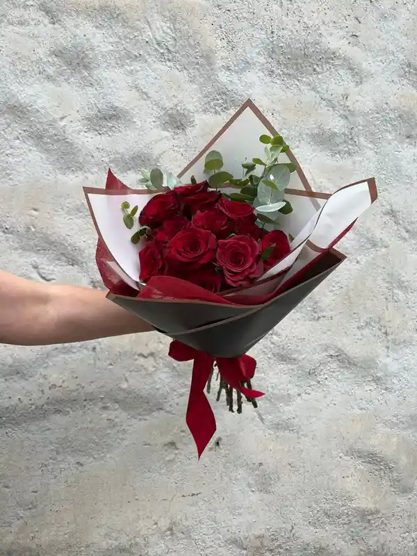 Ramo de 12 Rosas Rojas importadas más Eucalyptus Guni, todo presentado en hermosos papeles y cintas de raso.