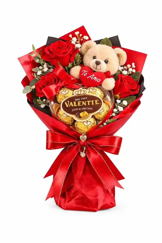 Ramo de 3 rosas con peluche y chocolate valentten 5 unidades