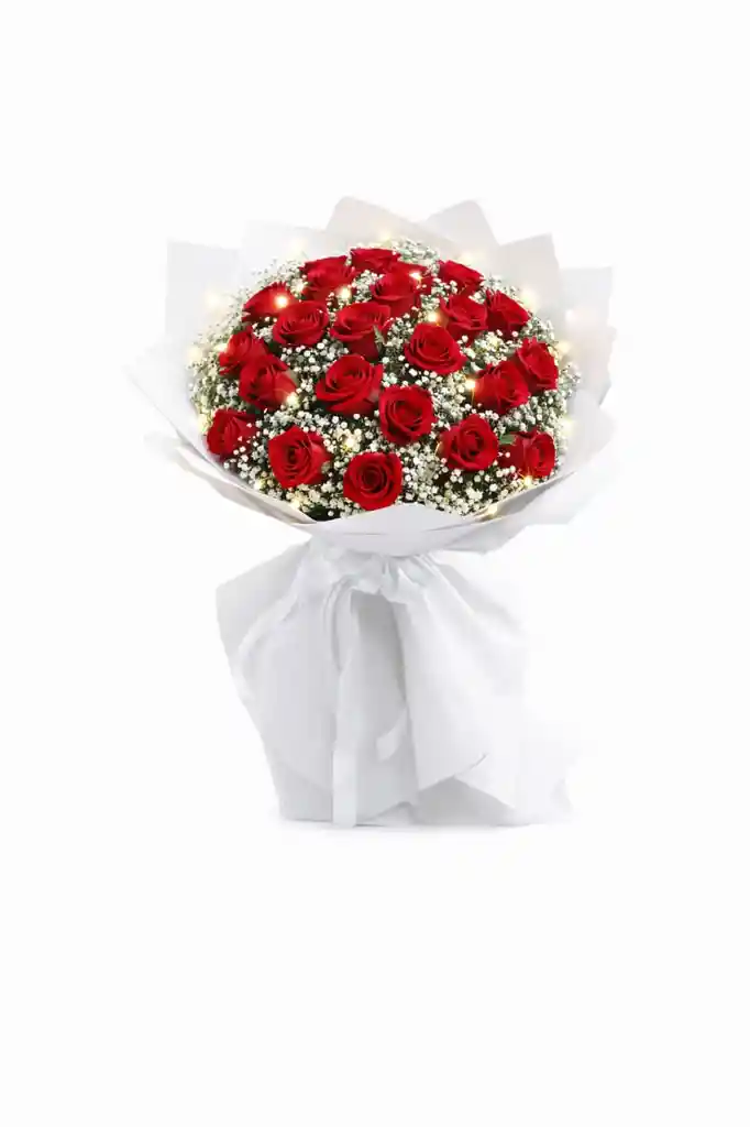 Imponente ramo de 24 rosas rojas ecuatorianas con gypsophila envuelto en papel elegante
