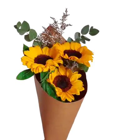 Ramo de 3 Girasoles medianos con follaje y envueltos en papel karft. Los colores de las flores pueden variar según disponibilidad de mercado y temporada.