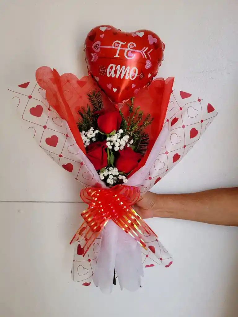 Ramo de 3 Rosas incluye follaje, papeleria y tarjetita + Globo metalizado Rosas de color Rojo ideal para el Amor