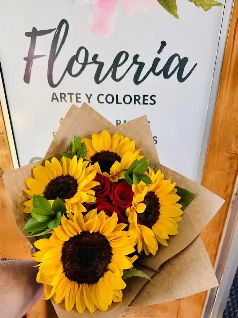 RAMO 4 GIRASOLES CON ROSAS ROJAS IMPORTADAS