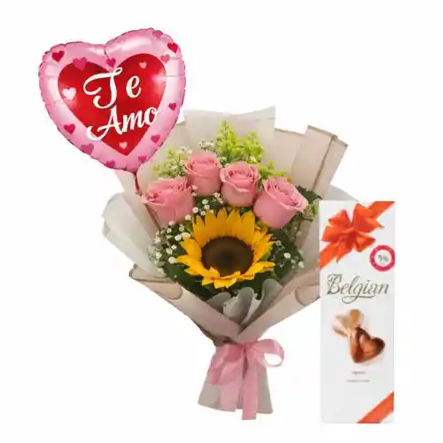 RAMO 4 ROSA 1 GIRASOL CHOCOLATE BELGIAN Y GLOBITO