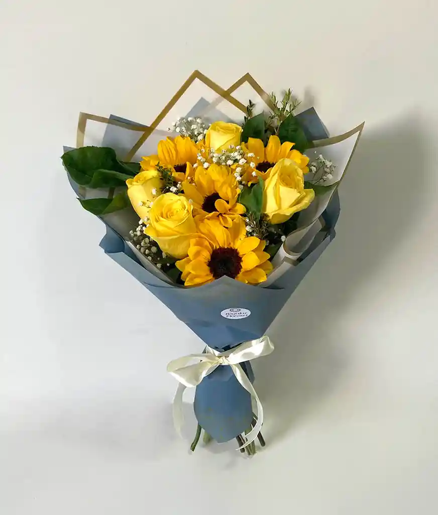 Ramo de 4 girasoles y 4 rosas amarillas ecuatorianas con follaje, envueltos en papel decorativo y cinta