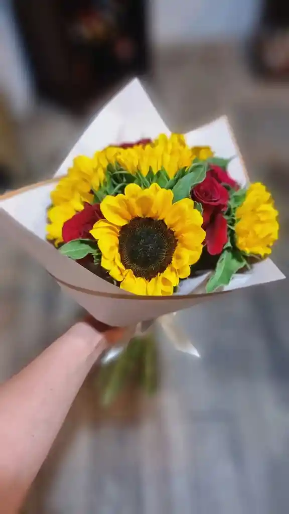 Delicado Ramo de 5 Girasoles y 4 Rosas, envuelto en papel beige. Si requiere tarjeta, dejar el mensaje en los comentarios.