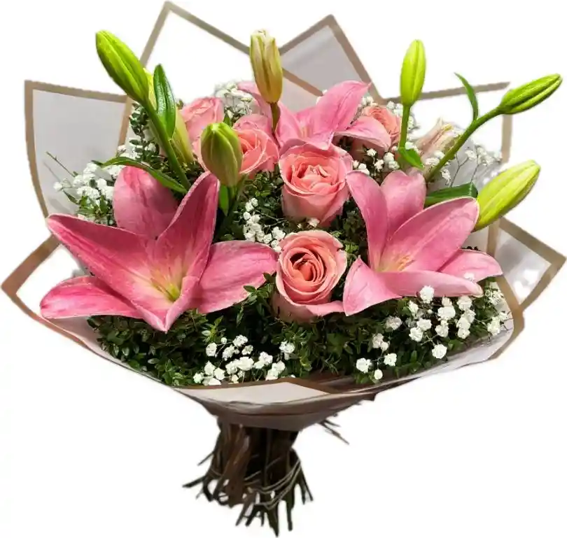 RAMO 5 ROSAS ROSADAS CON 3 LILIUM