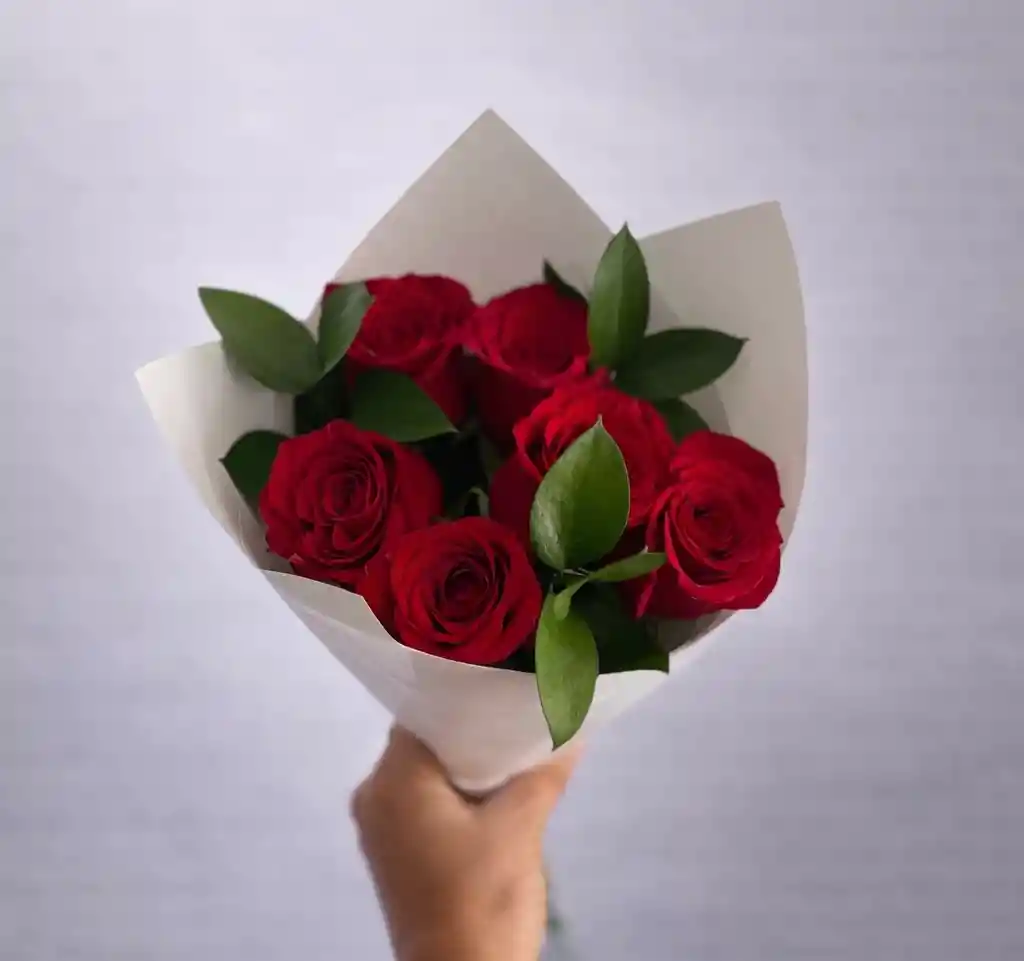 Ramo de 6 rosas naturales importadas con follaje verde, envuelto en papel floral.