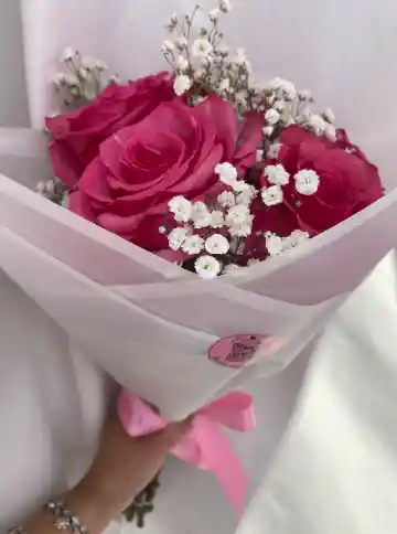 Ramo de 6 rosas Fucsia. Tarjeta con mensaje (sin sobre) sin costo adicional. Todo envuelto en un hermoso papel decorativo.