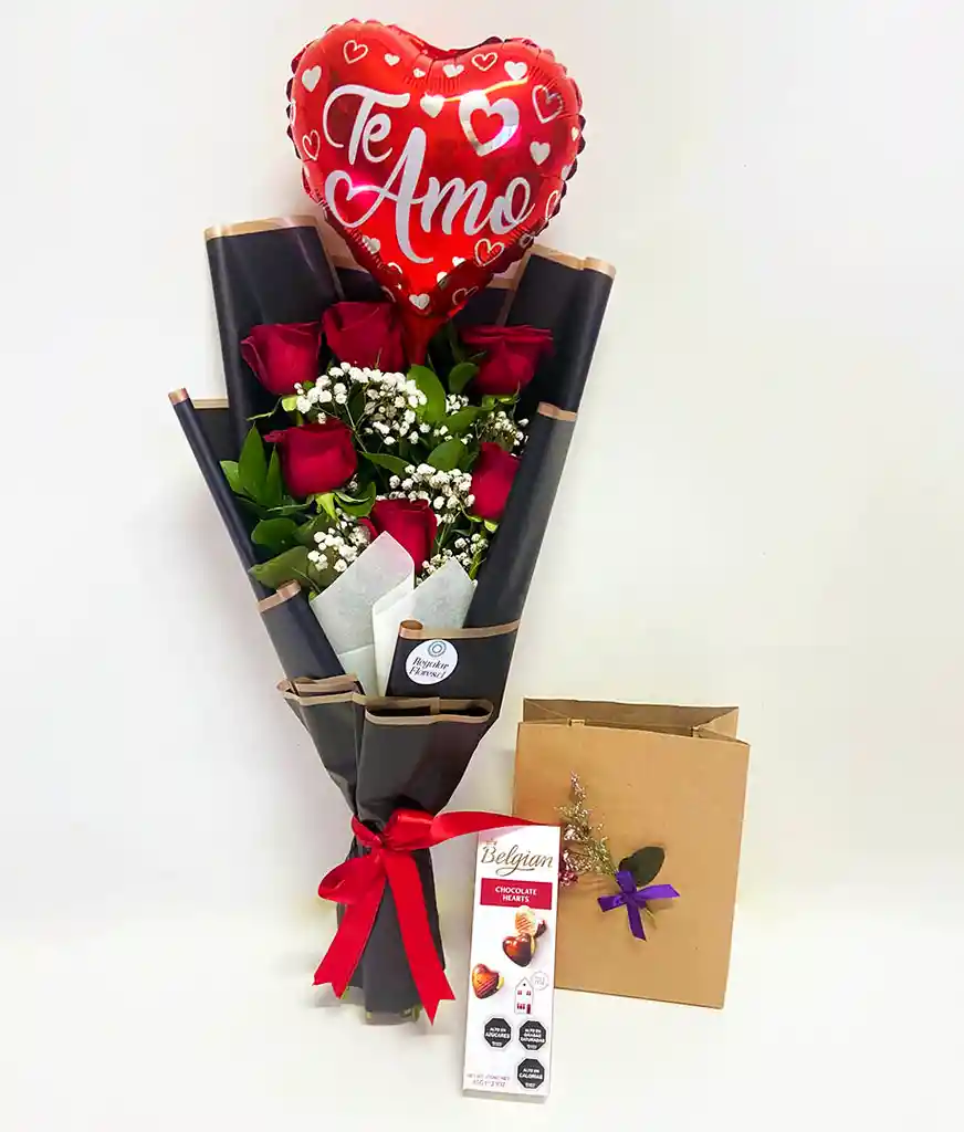 Ramo de 6 rosas ecuatorianas en tono rojo + chocolates Belgian heart 65 gr. + Globo Te Amo (modelo puede variar segun stock)