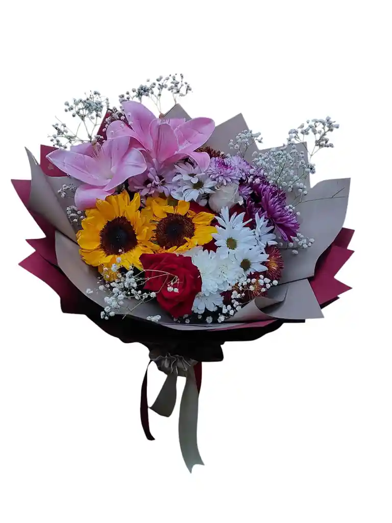 Ramo con girasoles, mables, Lilium es su gran expresión y follaje de estación.