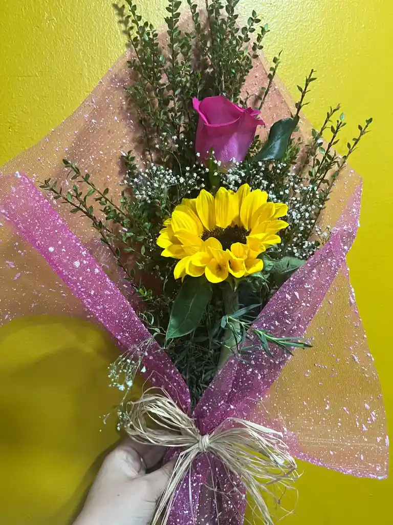 Ramo amistad. Incluye 1 rosa ecuatoriana, 1 girasol y follaje verde presentación papel de arroz con amarra rafia.