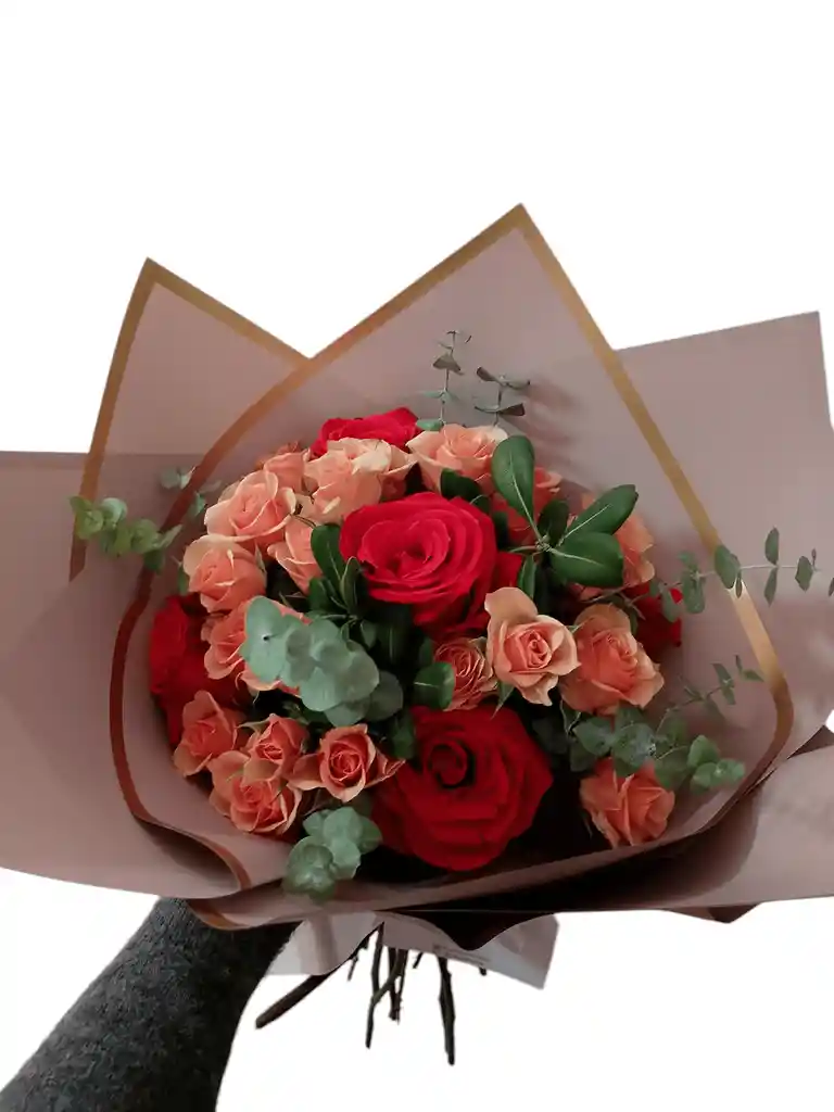 Ramo de 5 tosas rojas y 9 varas florales de mini rosas color palo de rosa ( 5 flores cada vara aprox). Puedes elegir papel rojo, beige, negro o damasco.