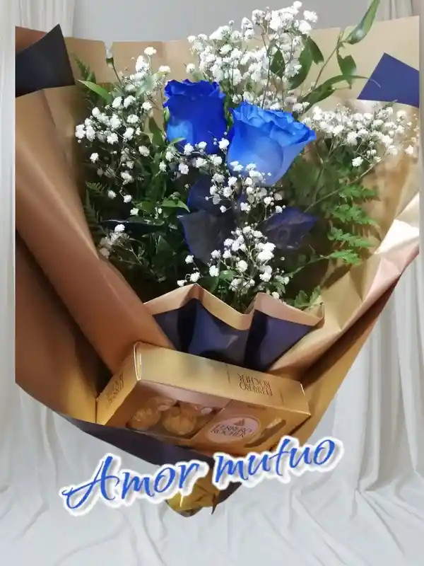"Por que el verdadero amor se comparte... como este hermoso ramo de rosas azules y dulces momentos" Un detalle único y elegante que une lo mejor de dos mundos: la intensidad de las Rosas azules importadas acompañadas de la delicadeza de la gypsophilia blanca, envueltas en un fino papel metálico que resalta su belleza. Este arreglo incluye además una caja de bombones Ferrero Rocher, convirtiéndolo en el regalo perfecto para expresar sentimientos profundos y compartir un momento inolvidable. Ideal para aniversarios, fechas especiales o simplemente para sorprender con un gesto lleno de amor y distinción. Incluya tarjeta personalizada.