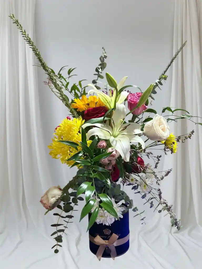 " Una explosión de color y frescura que ilumina cualquier espacio" Un arreglo floral lleno de vida y movimiento, diseñado para impactar. Incluye lirios blancos, girasoles, rosas y flores mixtas de temporada, cuidadosamente dispuestas en una elegante base, con lazo decorativo. Su estilo silvestre y sofisticado lo convierte en el regalo perfecto para cumpleaños, aniversarios o cualquier ocasión especial. incluye caja de bombones Ferrero Rocher 8 unidades y tarjeta de salidos.