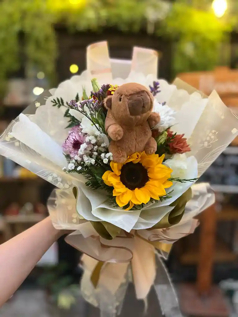 Que la aventura florezca con nuestro Ramo Girasol Aventura! Este encantador bouquet captura la esencia de un día soleado, con un simpático capibara que se sienta cómodamente sobre un vibrante girasol, rodeado de flores en cálidos tonos tierra. ¡Un regalo único para los pequeños exploradores y amantes de la naturaleza!