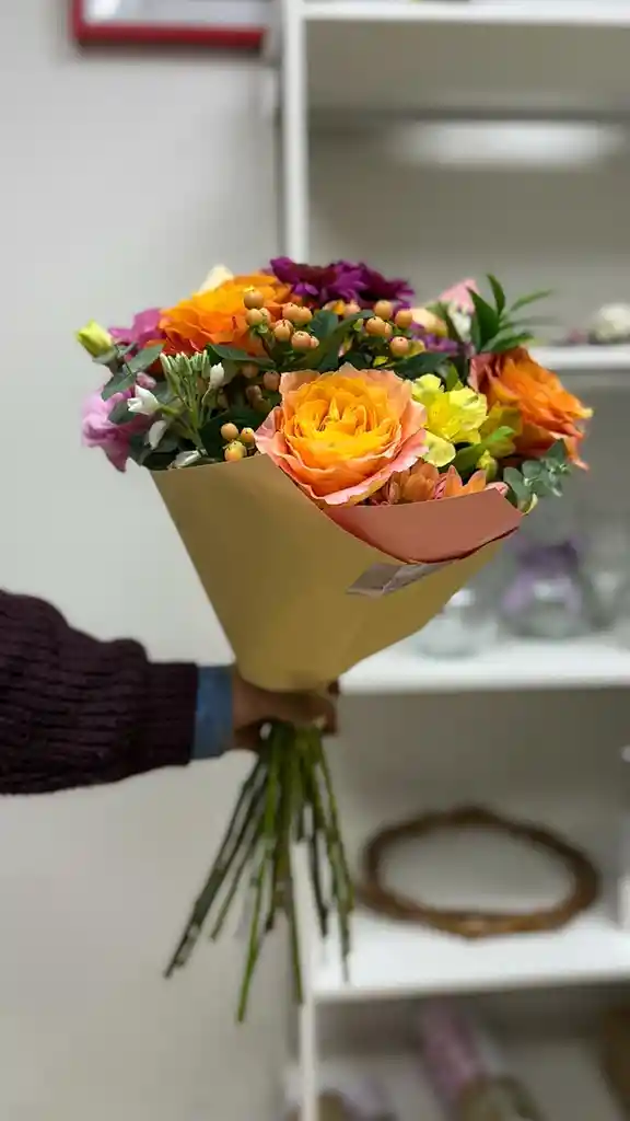 Ramo con 14und entre flores y verdes, variedad de flores y colores en tonalidades vibrantes. envuelto en papel a combinación. LAS FLORES VARIAN SEGUN DISPONIBILIDAD