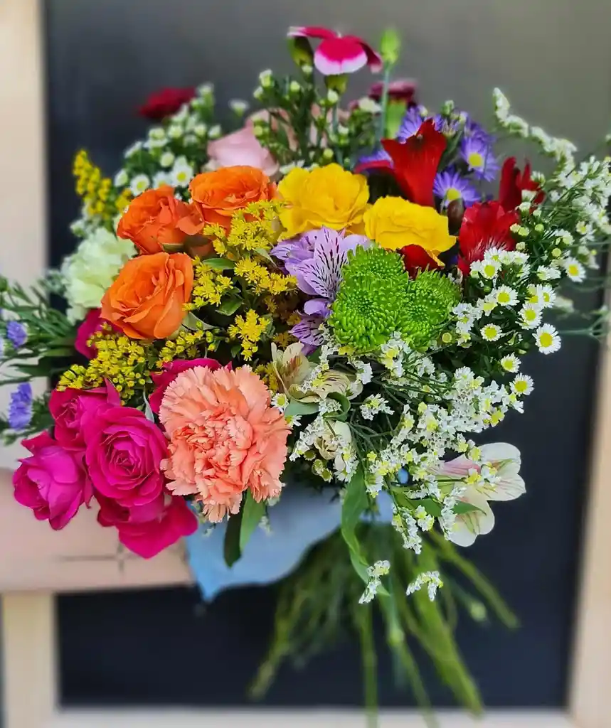 Ramo Colorful, 18 varas. Este es el ramo "Colorful" de flores frescas, con múltiples colores. Tiene minirosas, limonium, maules, miniclaveles, astromelias, entre otros. Son dieciocho varas que vienen envueltas en papeles preciosos para sorprender a quien quieras y listo para que lo puedas poner en un jarro o florero (no incluído). Además, incluiremos un sobre de alimento para flores! Recuerda sumar un mensaje que escribiremos a mano e incluiremos en una tarjeta junto a las flores.