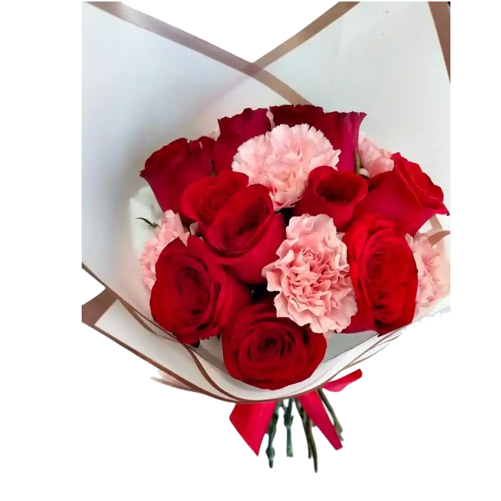 Hermoso ramo con 12 Rosas rojas y astromelias amarillas envueltas en papel y cinta.
