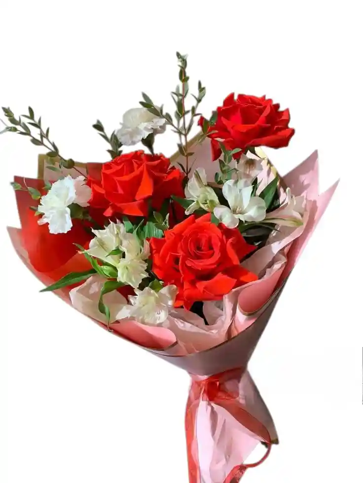 Hermoso ramo con 3 rosas rojas y 3 astromelias blancas envueltas en papel y cinta.