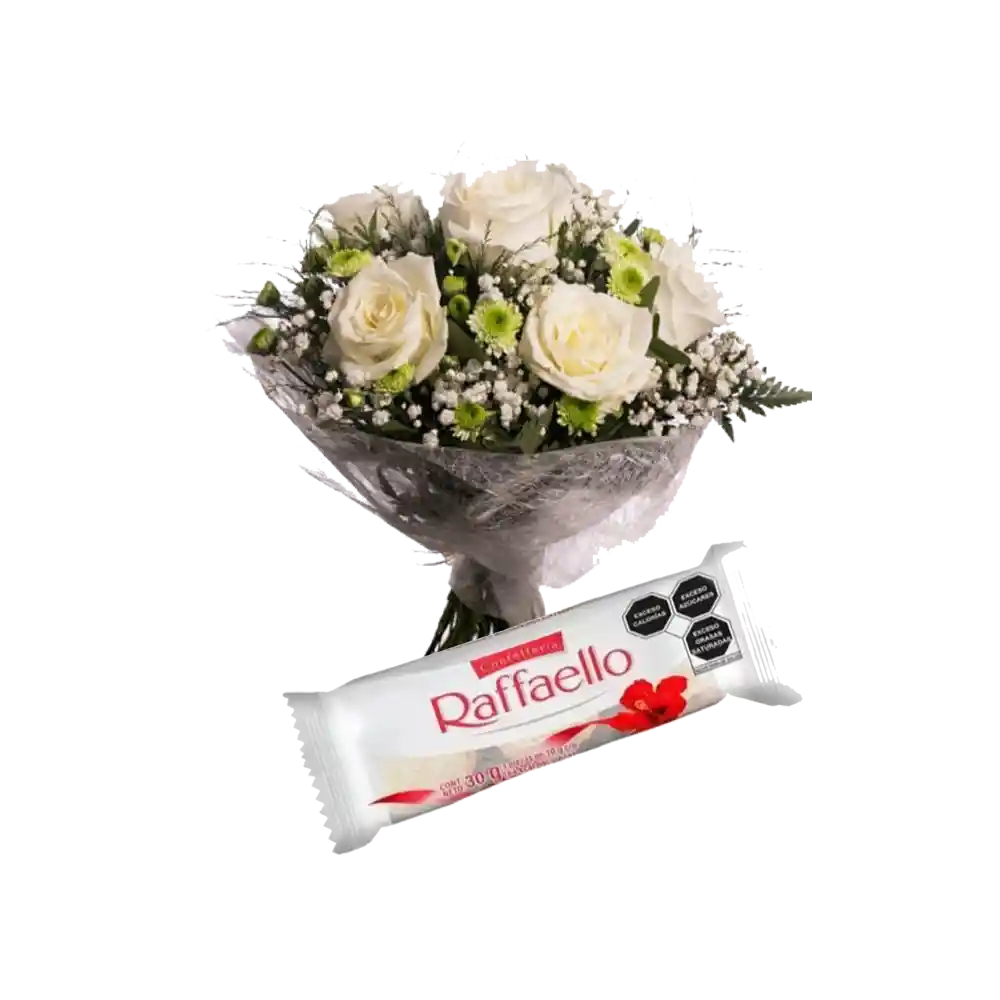 Hermoso ramo envuelto en papel y cinta con 6 rosas importadas en color blanco más bombones Raffaello de 3 unidades.